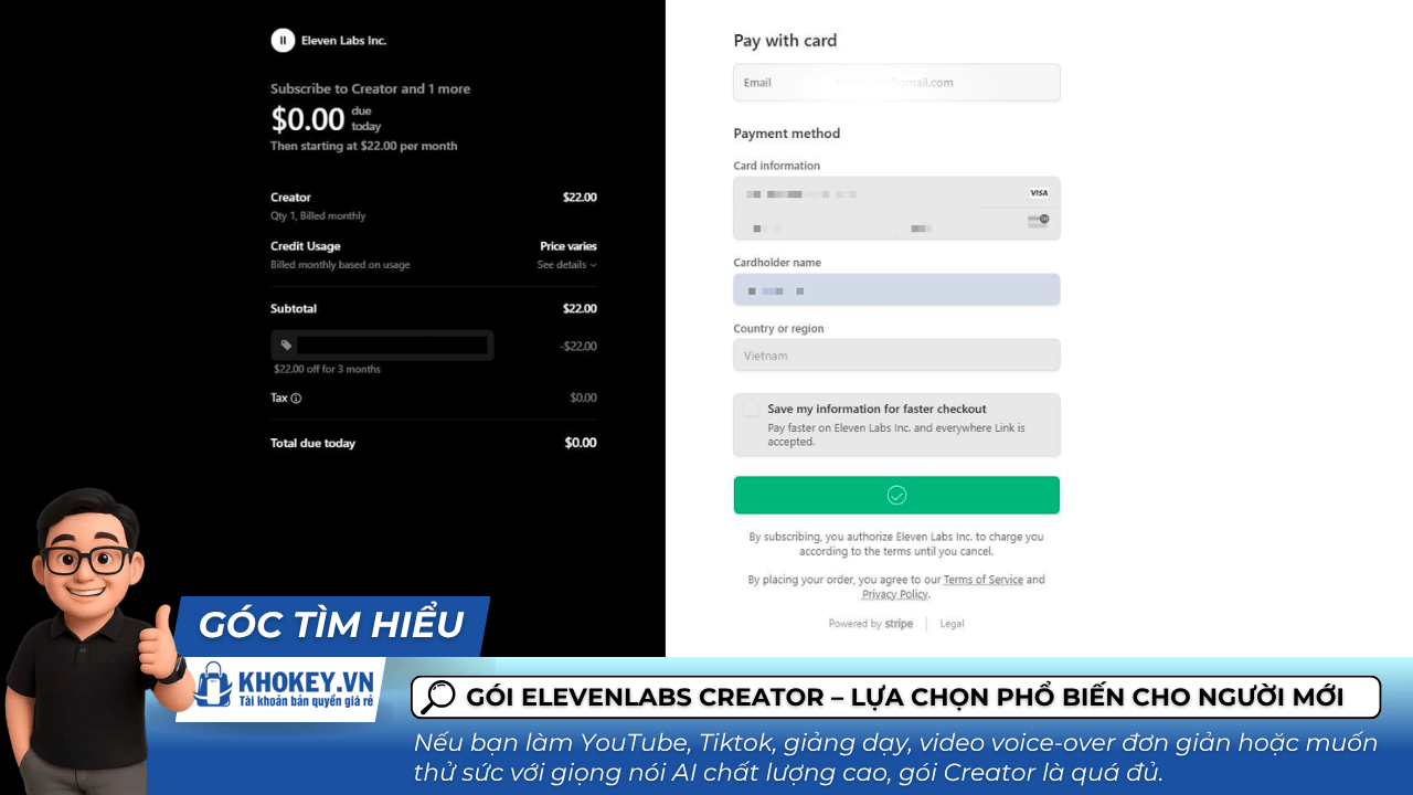 Điều tuyệt vời là bạn không cần phải trả mức giá quá cao để sở hữu bản quyền. Tại Khokey.vn, bạn có thể mua Key ElevenLabs AI chính hãng giá rẻ, nâng cấp trực tiếp vào tài khoản cá nhân, dùng riêng, có bảo hành trọn thời gian sử dụng.