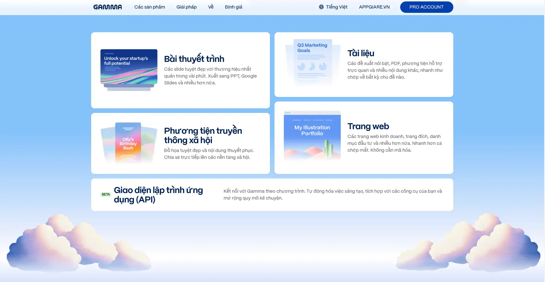 Không chỉ giới hạn ở slide, Gamma PRO còn cho phép tạo tài liệu dạng web, báo cáo dài hoặc landing page trình bày sản phẩm. Một tài khoản Gamma PRO có thể thay thế nhiều công cụ khác nhau, giúp tối ưu chi phí khi lựa chọn Gamma Pro giá rẻ nhưng vẫn đáp ứng đa dạng nhu cầu công việc.