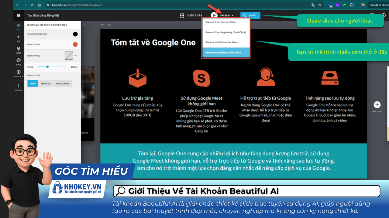 Tại KHOKEY.VN, tài khoản Beautiful AI gói Edu giá chỉ 220K/năm mang đến cơ hội sử dụng công cụ mạnh mẽ này với chi phí thấp, đặc biệt phù hợp cho học sinh, sinh viên và giáo viên. Đây là lựa chọn lý tưởng để nâng tầm chất lượng thuyết trình mà không tốn nhiều thời gian hay chi phí.