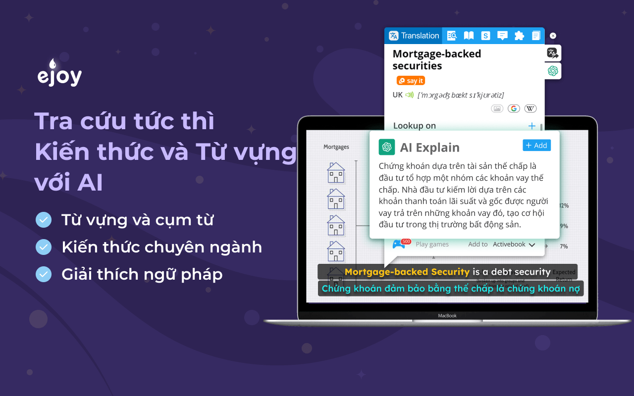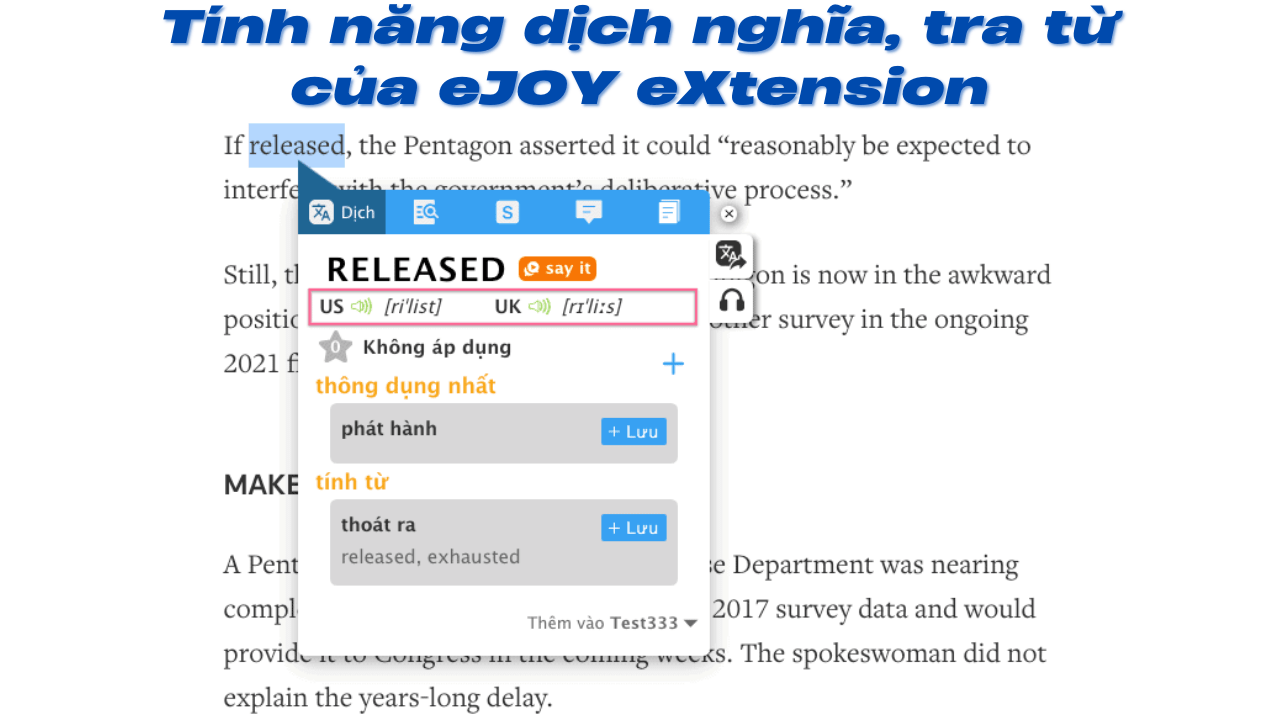- Gợi ý từ vựng theo ngữ cảnh: eJOY không chỉ giúp bạn học từ mới mà còn gợi ý cách sử dụng từ vựng trong các tình huống cụ thể, giúp việc học trở nên thực tế và ứng dụng cao hơn.