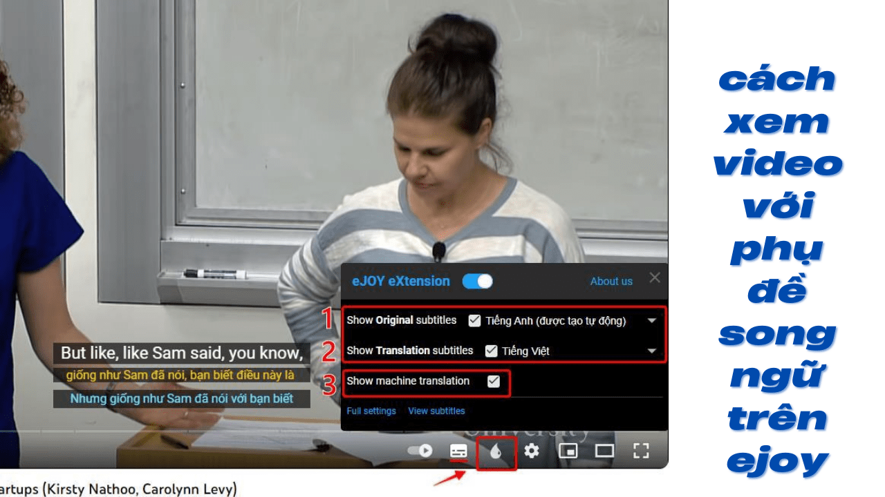 - Bấm vào biểu tượng eJOY và bật chế độ phụ đề song ngữ để vừa xem vừa học từ vựng.